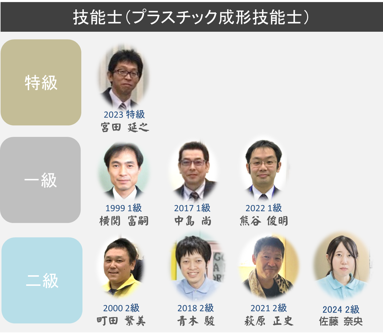「社員を幸せにする」を経営理念に掲げ、その一つ「個の力」を上げるでは、プラスチック射出成形技能士の育成に取り組み、特級技能士をはじめ国家資格者が多数在籍し、女性の技能士も誕生しています。